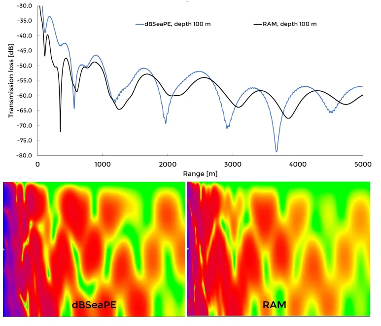 Section titled “3.1.2 Parabolic Equation Method”Image 9. Transmission losses for dBSeaPE and RAM. Depth 100 m is shown in chart, while full transects in colour are presented below.