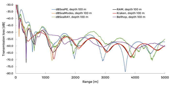 The following results are based on a comparison of dBSea’s solvers with solvers from the AcTUP toolbox (AcTUP Toolbox), covering the three most popular methods of calculating the sound field, namely: