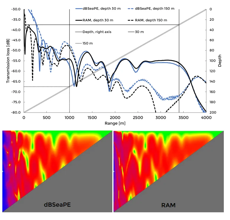 Section titled “1.1.1 Parabolic Equation Method”Image 2. Transmission losses for dBSeaPE and RAM. Depths 30 m and 150 m are shown in chart, while full transects in colour are presented below.