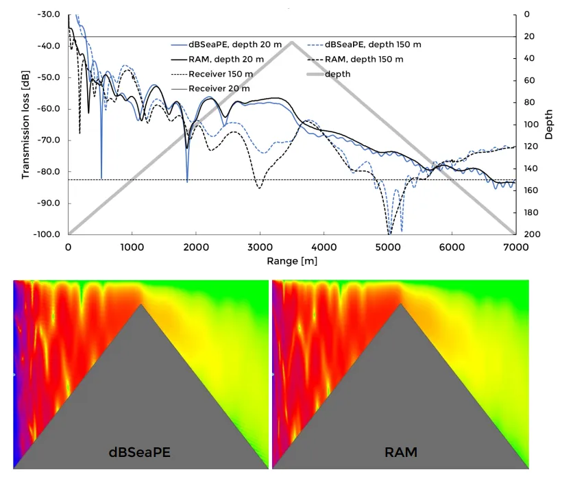 Section titled “2.1.1 Parabolic Equation Method”Image 6. Transmission losses for dBSeaPE and RAM. Depths 20 m and 150 m are shown in chart, while full transects in colour are presented below.