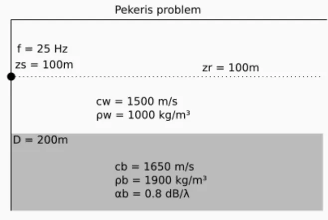 Section titled “3.1 Pekeris Problem”The Pekeris problem is a horizontally flat waveguide, designed to test propagation in an environment with a moderately absorbent sediment. See here for details about the Pekeris Problem