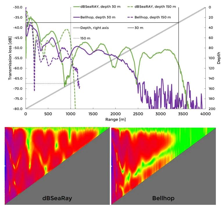 Section titled “1.1.2 Ray Tracing Method”Image 4. Transmission losses for dBSeaRay and Bellhop. Depths 30 m and 150 m are shown in chart, while full transects in colour (-20 dB to -70 dB) are presented below.