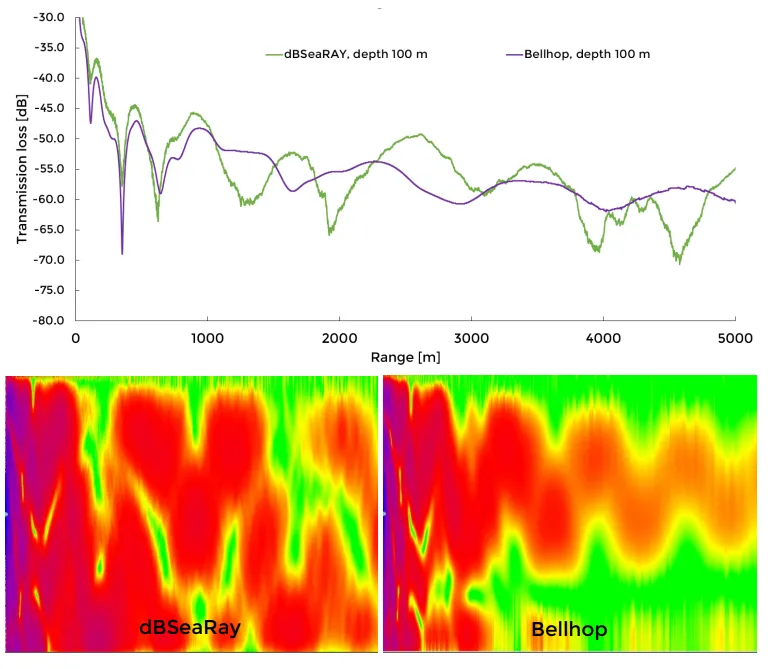 Section titled “3.1.3 Ray Tracing Method”Image 11. Transmission losses for dBSeaRay and Bellhop. Depth 100 m is shown in chart, while full transects in colour are presented below.