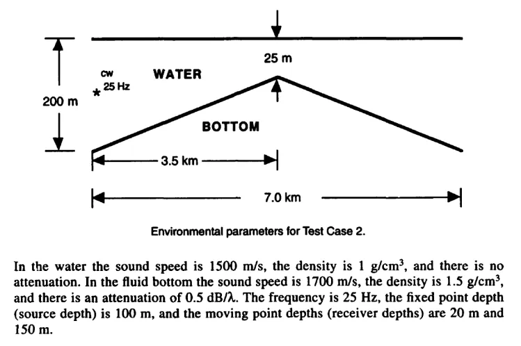Section titled “2.1 Parabolic Equation Workshop II 1993 – Case II”An upslope-downslope problem formulated to test the energy conservation in strongly range-dependent environments was formulated in (Chin-Bing et al., 1993). The UWA file for this scenario is available at: UWA File