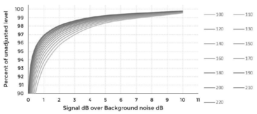 Image 1. If background levels are just 3 dB under signal levels they contribute less than 3% to the total sound pressure level (less at higher levels). The different lines correspond to different sound pressure levels, the louder the noise, the smaller the contribution from less loud background noise.