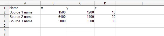 The data (and every row of the data) must have 4 columns. The columns are Name, x, y, z. A header row (i.e. “Name, x , y , z”) is optional. Each subsequent row represents a single source. The Name field is a free text field, and the x, y and z fields must contain numbers, and will be interpreted as feet or meters, depending on the current imperial/metric units setting. It is not necessary to enclose the name field in quotation marks.